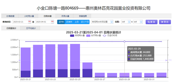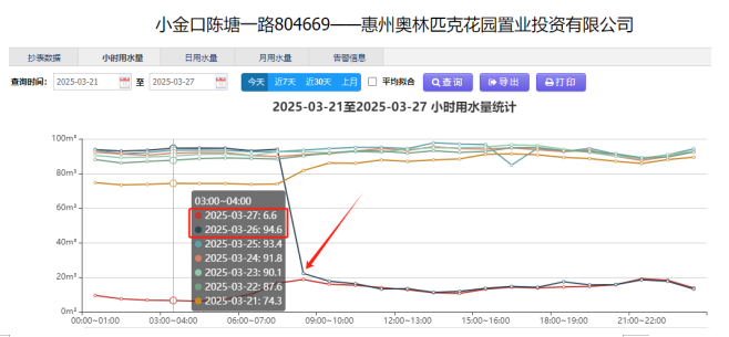 2025年3月,奧林匹克花園小區(qū)進水管道在智慧水務(wù)平臺監(jiān)測中持續(xù)觸發(fā)異常預(yù)警。公司調(diào)度服務(wù)中心控漏組以DMA分區(qū)監(jiān)控數(shù)據(jù)為基準(zhǔn),發(fā)現(xiàn)該封閉區(qū)域內(nèi)實際漏水量與理論用水量差值超常,數(shù)據(jù)顯示該管道每日0點至6點最小流量達94.6m3/h,較去年同期暴增15倍以上;日間水量亦較日常均值持續(xù)攀升。同時,客服短期內(nèi)連續(xù)接到該小區(qū)居民水壓不足的投訴,經(jīng)多維度數(shù)據(jù)交叉驗證,研判其存在較大隱蔽性暗漏風(fēng)險?。